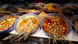 Walk along the street and browse the shops to find one that sells countless varieties of baijiu, a Chinese spirit that has an alcohol content of over 20%. If you can, sample the peach and rose flavors. They’re both potent but very tasty! Further along Hefang Street are stalls selling a variety of foods on a stick, including wontons, chicken with wild mushrooms, and fish balls. You can get six skewers for just 9 Yuan (roughly $1.31 U.S.). One of my street food highlights is beef and pork jerky samples that the friendly vendors fed me. Beware, they are spicy, but if you can handle the heat, they’re so worth it!